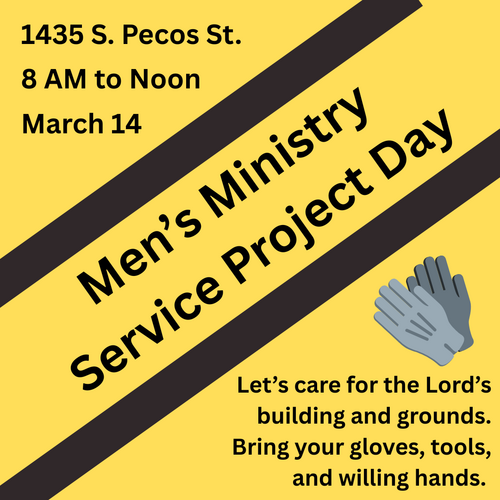 March 14th from 8 AM to Noon, come fellowship with our men's ministry and participate in some work projects to maintain and beautify our building and grounds. Bring along your gloves, yard work or handyman tools, and willing hands. All skill levels welcome!